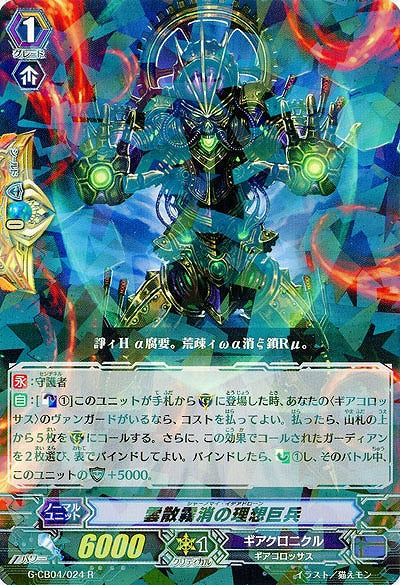 【永】:守護者【自】:[【カウンターブラスト】(1)]このユニットが手札から(G)に登場した時、あなたの〈ギアコロッサス〉のヴァンガードがいるなら、コストを払ってよい。払ったら、山札の上から5枚を(G)にコールする。さらに、この効果でコールされたガーディアンを2枚選び、表でバインドしてよい。バインドしたら、【カウンターチャージ】(1)し、そのバトル中、このユニットのシールド+5000。