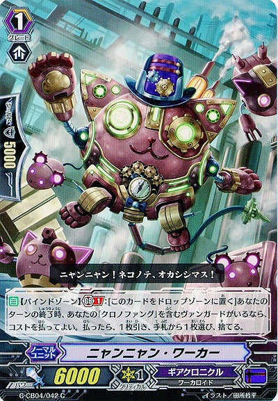 【自】【バインドゾーン】【Gブレイク】(1):[このカードをドロップゾーンに置く]あなたのターンの終了時、あなたの「クロノファング」を含むヴァンガードがいるなら、コストを払ってよい。払ったら、1枚引き、手札から1枚選び、捨てる。
