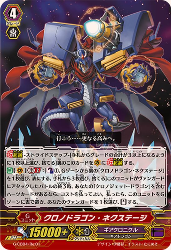 【超越】-ストライドステップ-[手札からグレードの合計が3以上になるように1枚以上選び、捨てる]裏のこのカードを(V)に【超越】する。【自】【(V)】【Gブレイク】(2):[【カウンターブラスト】(1),Gゾーンから裏の「クロノドラゴン・ネクステージ」を1枚選び、表にする,手札から3枚選び、捨てる]このユニットがヴァンガードにアタックしたバトルの終了時、あなたの「クロノジェット・ドラゴン」を含むハーツカードがあるなら、コストを払ってよい。払ったら、このユニットをGゾーンに表で置き、あなたのヴァンガードを1枚選び、【スタンド】する。