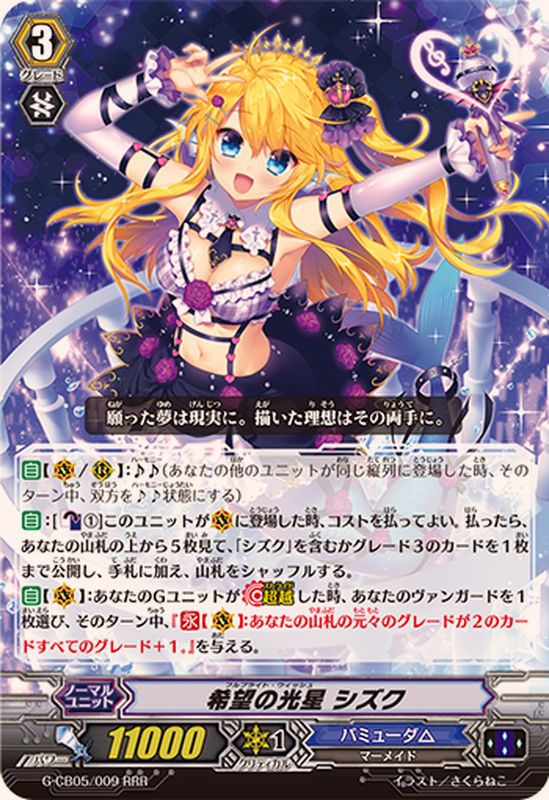 【自】【(V)/(R)】:♪♪(あなたの他のユニットが同じ縦列に登場した時、そのターン中、双方を♪♪状態にする)【自】:[【カウンターブラスト】(1)]このユニットが(V)に登場した時、コストを払ってよい。払ったら、あなたの山札の上から5枚見て、「シズク」を含むかグレード3のカードを1枚まで公開し、手札に加え、山札をシャッフルする。【自】【(V)】:あなたのGユニットが【超越】した時、あなたのヴァンガードを1枚選び、そのターン中、『【永】【(V)】:あなたの山札の元々のグレードが2のカードすべてのグレード+1。』を与える。
