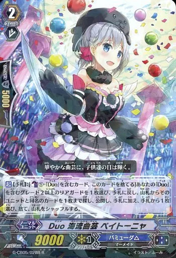 【起】【手札】:[【カウンターブラスト】(1)-「Duo」を含むカード,このカードを捨てる]あなたの「Duo」を含むグレード2以上のリアガードを1枚選び、手札に戻し、山札からそのユニットと同名のカードを1枚まで探し、公開し、手札に加え、手札から1枚選び、捨て、山札をシャッフルする。