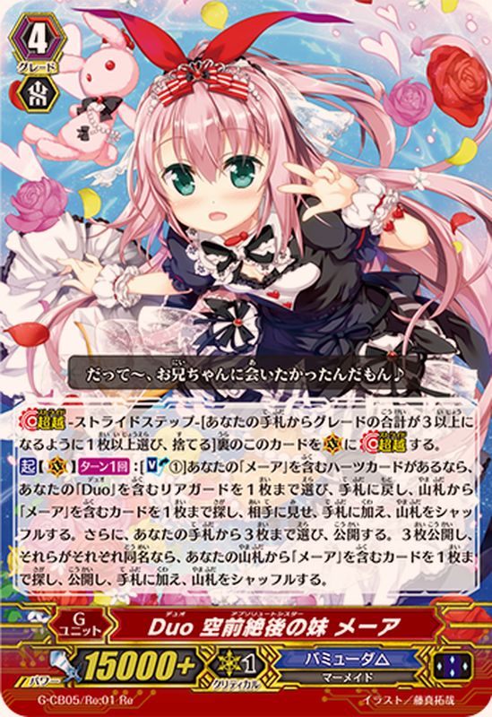 【超越】-ストライドステップ-[あなたの手札からグレードの合計が3以上になるように1枚以上選び、捨てる]裏のこのカードを(V)に【超越】する。【起】【(V)】【ターン1回】:[【ソウルブラスト】(1)]あなたの「メーア」を含むハーツカードがあるなら、あなたの「Duo」を含むリアガードを1枚まで選び、手札に戻し、山札から「メーア」を含むカードを1枚まで探し、相手に見せ、手札に加え、山札をシャッフルする。さらに、あなたの手札から3枚まで選び、公開する。3枚公開し、それらがそれぞれ同名なら、あなたの山札から「メーア」を含むカードを1枚まで探し、公開し、手札に加え、山札をシャッフルする。