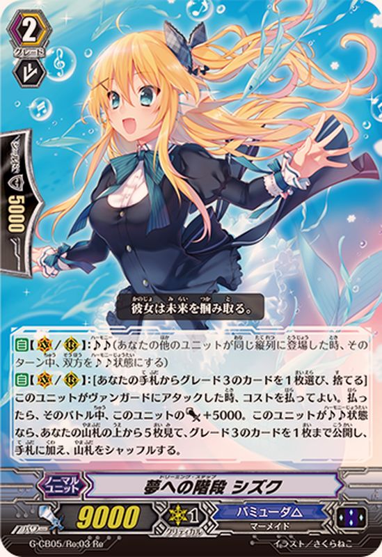 【自】【(V)/(R)】:♪♪(あなたの他のユニットが同じ縦列に登場した時、そのターン中、双方を♪♪状態にする)【自】【(V)/(R)】:[あなたの手札からグレード3のカードを1枚選び、捨てる]このユニットがヴァンガードにアタックした時、コストを払ってよい。払ったら、そのバトル中、このユニットのパワー+5000。このユニットが♪♪状態なら、あなたの山札の上から5枚見て、グレード3のカードを1枚まで公開し、手札に加え、山札をシャッフルする。