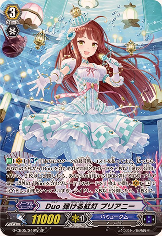【自】【(V)】:[【ソウルブラスト】(1)]あなたのターンの終了時、コストを払ってよい。払ったら、あなたの手札から「Duo」を含むそれぞれ同名のカードを2枚以上選び、公開してよい。2枚以上公開したら、あなたの山札から「Duo 弾ける紅灯 プリアニー」以外の、「Duo」を含むグレード3のカードを1枚まで探し、(V)に【レスト】でライドし、山札をシャッフルする。ライドし、3枚以上公開したら、1枚引く。