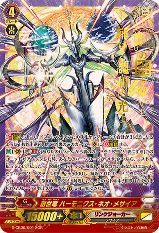 【超越】-ストライドステップ-[あなたの手札からグレードの合計が3以上になるように1枚以上選び、捨てる]裏のこのカードを(V)に【超越】する。【自】【(V)】【Gブレイク】(3):[あなたのGゾーンから裏のカードを1枚選び、表にする]このユニットがアタックした時、あなたのハーツカードが〈メサイア〉なら、コストを払ってよい。払ったら、呪縛カードすべてを解呪し、解呪されたあなたのユニットをすべて選び、そのターン中、パワー+5000し、解呪されたカード1枚につき、このユニットのパワー+5000。5枚以上解呪したら、そのバトル中、相手は自分の手札からグレード1以上のカードを(G)にコールできない。