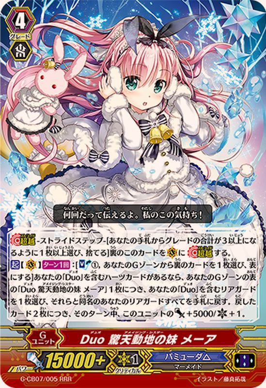 【超越】-ストライドステップ-[あなたの手札からグレードの合計が3以上になるように1枚以上選び、捨てる]裏のこのカードを(V)に【超越】する。【起】【(V)】【ターン1回】:[【ソウルブラスト】(1),あなたのGゾーンから裏のカードを1枚選び、表にする]あなたの「Duo」を含むハーツカードがあるなら、あなたのGゾーンの表の「Duo 驚天動地の妹 メーア」1枚につき、あなたの「Duo」を含むリアガードを1枚選び、それらと同名のあなたのリアガードすべてを手札に戻す。戻したカード2枚につき、そのターン中、このユニットのパワー+5000/クリティカル+1。