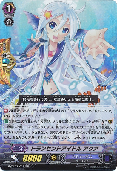 【永】:守護者。ただしデッキの守護者がすべて「トランセンドアイドル アクア」なら、6枚まで入れてよい。【自】:[あなたの手札から1枚選び、ソウルに置く]このユニットが手札から(G)に登場した時、コストを払ってよい。払ったら、あなたのユニットを1枚選び、そのバトル中、ヒットされない。あなたのドロップゾーンに守護者が2枚以上なら、あなたのリアガードをすべて選び、そのターン中、ヒットされない。
