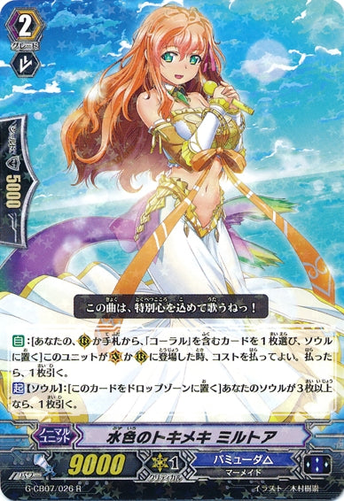 【自】:[あなたの、(R)か手札から、「コーラル」を含むカードを1枚選び、ソウルに置く]このユニットが(V)か(R)に登場した時、コストを払ってよい。払ったら、1枚引く。【起】【ソウル】:[このカードをドロップゾーンに置く]あなたのソウルが3枚以上なら、1枚引く。
