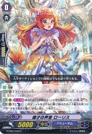 【自】:先駆【自】【(R)】:♪♪(あなたの他のユニットが同じ縦列に登場した時、そのターン中、双方を♪♪状態にする)【自】【(R)】【ターン1回】:あなたの♪♪状態のユニットが4枚以上になった時、【ソウルチャージ】(1)。【起】【(R)】:[【カウンターブラスト】(1),このユニットをソウルに置く]あなたの♪♪能力を持つリアガードを1枚まで選び、手札に戻し、1枚引く。