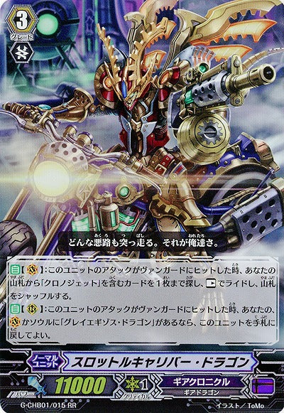 【自】【(V)】:このユニットのアタックがヴァンガードにヒットした時、あなたの山札から「クロノジェット」を含むカードを1枚まで探し、【レスト】でライドし、山札をシャッフルする。【自】【(R)】:このユニットのアタックがヴァンガードにヒットした時、あなたの、(V)かソウルに「グレイエギゾス・ドラゴン」があるなら、このユニットを手札に戻してよい。