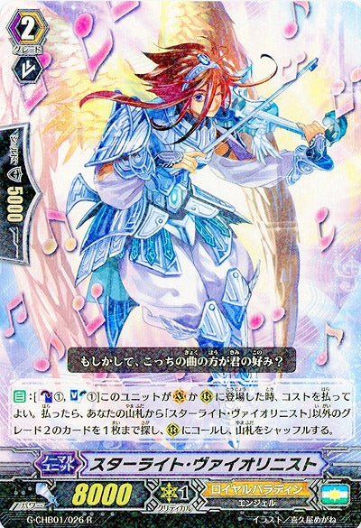 【自】:[【カウンターブラスト】(1),【ソウルブラスト】(1)]このユニットが(V)か(R)に登場した時、コストを払ってよい。払ったら、あなたの山札から「スターライト・ヴァイオリニスト」以外のグレード2のカードを1枚まで探し、(R)にコールし、山札をシャッフルする。