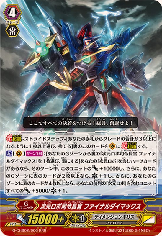 【超越】-ストライドステップ-[あなたの手札からグレードの合計が3以上になるように1枚以上選び、捨てる]裏のこのカードを(V)に【超越】する。【起】【(V)】【ターン1回】:[あなたのGゾーンから裏の「次元ロボ司令長官 ファイナルダイマックス」を1枚選び、表にする]あなたの「次元ロボ」を含むハーツカードがあるなら、そのターン中、このユニットのパワー+10000し、さらに、あなたのGゾーンに表のカードが2枚以上なら、クリティカル+1し、さらに、あなたのGゾーンに表のカードが4枚以上なら、あなたの前列の「次元ロボ」を含むユニットすべてのパワー+5000/クリティカル+1。