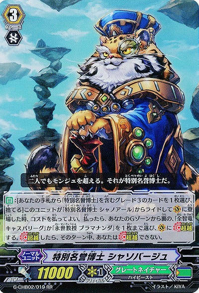 【自】:[あなたの手札から「特別名誉博士」を含むグレード3のカードを1枚選び、捨てる]このユニットが「特別名誉博士 シャノアール」からライドして(V)に登場した時、コストを払ってよい。払ったら、あなたのGゾーンから裏の、「全智竜 キャスパリーグ」か「永世教授 ブラマナンダ」を1枚まで選び、(V)に【超越】する。【超越】したら、そのターン中、あなたは【超越】できない。