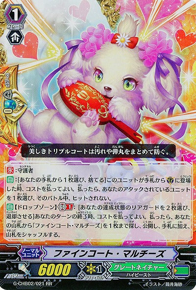【永】:守護者【自】:[あなたの手札から1枚選び、捨てる]このユニットが手札から(G)に登場した時、コストを払ってよい。払ったら、あなたのアタックされているユニットを1枚選び、そのバトル中、ヒットされない。【自】【ドロップゾーン】【Gブレイク】(1):[あなたの達成状態のリアガードを2枚選び、退却させる]あなたのターンの終了時、コストを払ってよい。払ったら、あなたの山札から「ファインコート・マルチーズ」を1枚まで探し、公開し、手札に加え、山札をシャッフルする。