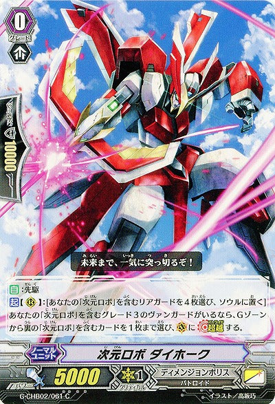 【自】:先駆【起】【(R)】:[あなたの「次元ロボ」を含むリアガードを4枚選び、ソウルに置く]あなたの「次元ロボ」を含むグレード3のヴァンガードがいるなら、Gゾーンから裏の「次元ロボ」を含むカードを1枚まで選び、(V)に【超越】する。