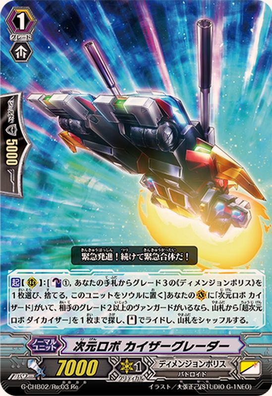 【起】【(R)】:[【カウンターブラスト】(1),あなたの手札からグレード3の《ディメンジョンポリス》を1枚選び、捨てる,このユニットをソウルに置く]あなたの(V)に「次元ロボ カイザード」がいて、相手のグレード2以上のヴァンガードがいるなら、山札から「超次元ロボ ダイカイザー」を1枚まで探し、【スタンド】でライドし、山札をシャッフルする。