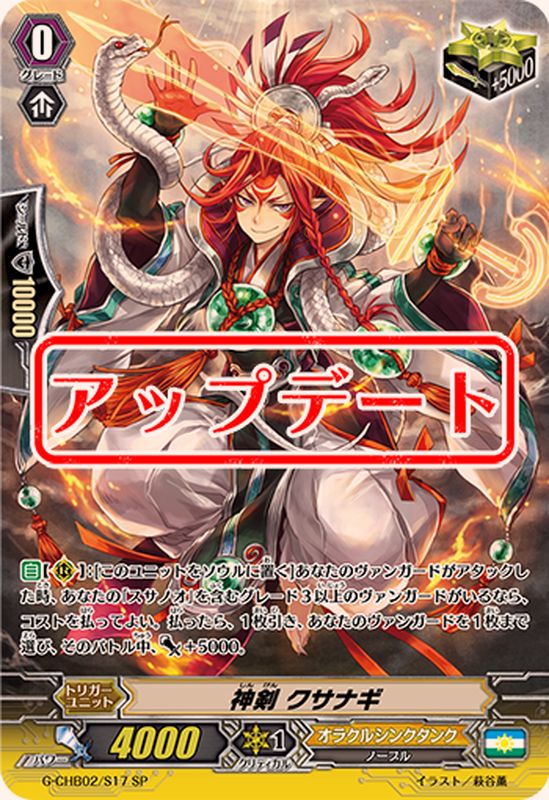 アップデート:シールド、トリガー、テキスト【自】【(R)】:「スサノオ」を含むグレード3以上のあなたのヴァンガードがアタックした時、【コスト】[このユニットをソウルに置く]ことで、1枚引き、あなたのヴァンガードを1枚選び、そのバトル中、パワー+5000。【自】:このカードがダメージチェックで出た時、1枚引く。