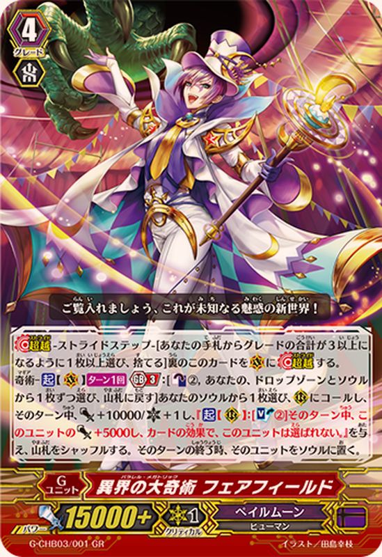 【超越】-ストライドステップ-[あなたの手札からグレードの合計が3以上になるように1枚以上選び、捨てる]裏のこのカードを(V)に【超越】する。奇術-【起】【(V)】【ターン1回】【Gブレイク】(3):[【カウンターブラスト】(2),あなたの、ドロップゾーンとソウルから1枚ずつ選び、山札に戻す]あなたのソウルから1枚選び、(R)にコールし、そのターン中、パワー+10000/クリティカル+1し、『【起】【(R)】:[【ソウルブラスト】(2)]そのターン中、このユニットのパワー+5000し、カードの効果で、このユニットは選ばれない。』を与え、山札をシャッフルする。そのターンの終了時、そのユニットをソウルに置く。