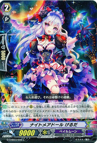 【自】:このユニットが(R)に登場した時、あなたの山札の上から3枚公開し、それらのカードがすべて「ナイトメアドール」を含むカードなら、その中から1枚選び、ソウルに置く。山札をシャッフルする。