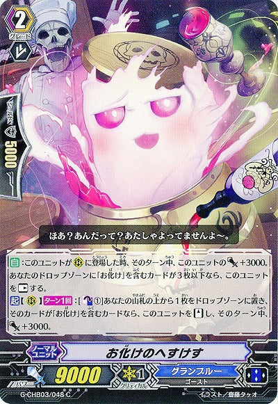 【自】:このユニットが(R)に登場した時、そのターン中、このユニットのパワー+3000。あなたのドロップゾーンに「お化け」を含むカードが3枚以下なら、このユニットを【レスト】する。【起】【(R)】【ターン1回】:[【カウンターブラスト】(1)]あなたの山札の上から1枚をドロップゾーンに置き、そのカードが「お化け」を含むカードなら、このユニットを【スタンド】し、そのターン中、パワー+3000。