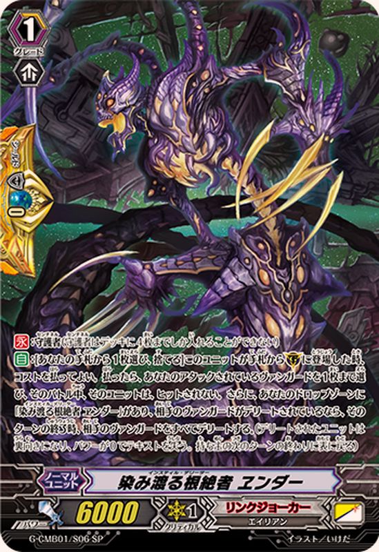 【永】:守護者(守護者はデッキに4枚までしか入れることができない)【自】:[あなたの手札から1枚選び、捨てる]このユニットが手札から(G)に登場した時、コストを払ってよい。払ったら、あなたのアタックされているヴァンガードを1枚まで選び、そのバトル中、そのユニットは、ヒットされない。さらに、あなたのドロップゾーンに「染み渡る根絶者 ヱンダー」があり、相手のヴァンガードがデリートされているなら、そのターンの終了時、相手のヴァンガードをすべてデリートする。(デリートされたユニットは裏向きになり、パワーが0でテキストを失う。持ち主の次のターンの終わりに表に戻る)