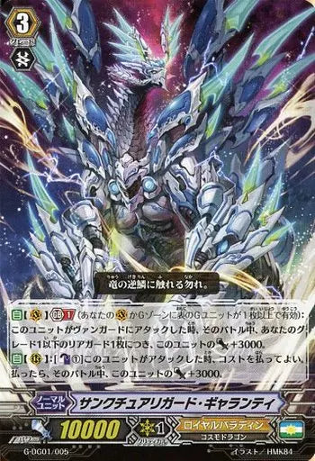 【自】【(V)】【Gブレイク】(1)(あなたの(V)かGゾーンに表のGユニットが1枚以上で有効):このユニットがヴァンガードにアタックした時、そのバトル中、あなたのグレード1以下のリアガード1枚につき、このユニットのパワー+3000。【自】【(R)】:[【カウンターブラスト】(1)]このユニットがアタックした時、コストを払ってよい。払ったら、そのバトル中、このユニットのパワー+3000。