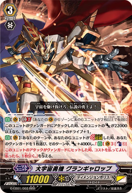 【自】【(V)】【Gブレイク】(2)(あなたの(V)かGゾーンに表のGユニットが2枚以上で有効):このユニットがヴァンガードにアタックした時、このユニットのパワーが22000以上なら、そのバトル中、このユニットのドライブ+1。【自】【(V)】:あなたのターン中、あなたのGユニットが【超越】した時、あなたのヴァンガードを1枚選び、そのターン中、パワー+4000し、『【自】【(V)】:[【カウンターブラスト】(1)]このユニットのアタックがヴァンガードにヒットした時、コストを払ってよい。払ったら、1枚引く。』を与える。
