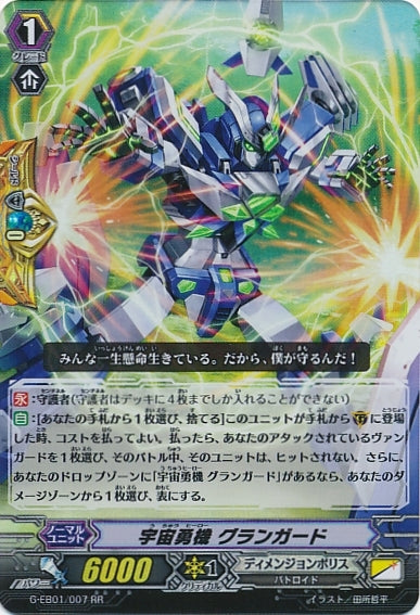 【永】:守護者(守護者はデッキに4枚までしか入れることができない)【自】:[あなたの手札から1枚選び、捨てる]このユニットが手札から(G)に登場した時、コストを払ってよい。払ったら、あなたのアタックされているヴァンガードを1枚選び、そのバトル中、そのユニットは、ヒットされない。さらに、あなたのドロップゾーンに「宇宙勇機 グランガード」があるなら、あなたのダメージゾーンから1枚選び、表にする。