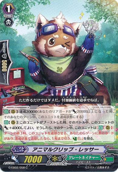 【自】【(R)】:達成20000(あなたのリアガードがパワー20000以上になった時、そのあなたのターン中、このユニットを達成状態にする)【自】【(R)】:このユニットがブーストした時、そのバトル中、このユニットのパワー+4000してよい。そうしたら、そのターン中、このユニットは『【自】【(R)】:ターンの終了時、このユニットを退却させる。あなたのGゾーンに表のカードがあり、達成状態で退却したなら、1枚まで引き、【カウンターチャージ】(1)。』を得る。