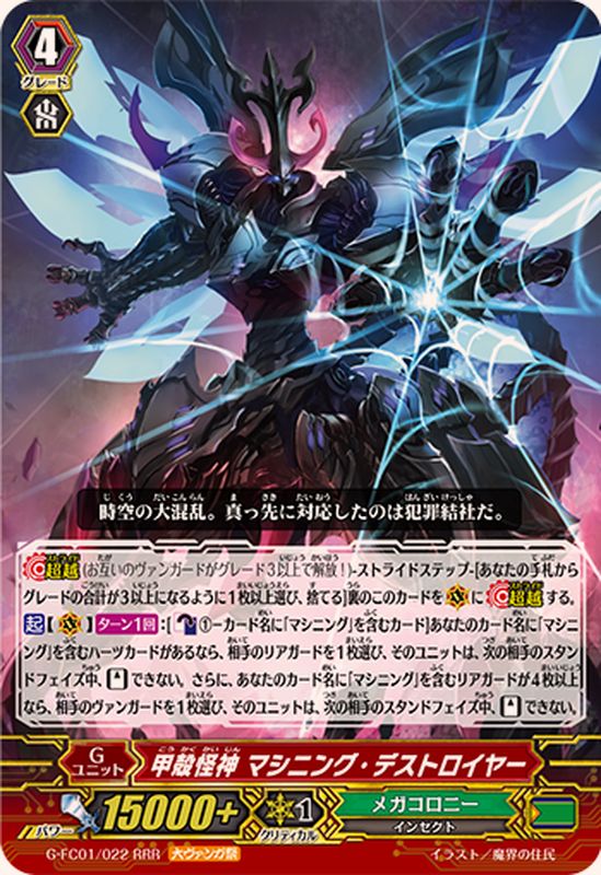 【超越】(お互いのヴァンガードがグレード3以上で解放!)-ストライドステップ-[あなたの手札からグレードの合計が3以上になるように1枚以上選び、捨てる]裏のこのカードを (V)に【超越】する。【起】【(V)】【ターン1回】:[【カウンターブラスト】(1)-カード名に「マシニング」を含むカード]あなたのカード名に「マシニング」を含むハーツカードがあるなら、相手のリアガードを1枚選び、そのユニットは、次の相手のスタンドフェイズ中、【スタンド】できない。さらに、あなたのカード名に「マシニング」を含むリアガードが4枚以上なら、相手のヴァンガードを1枚選び、そのユニットは、次の相手のスタンドフェイズ中、【スタンド】できない。