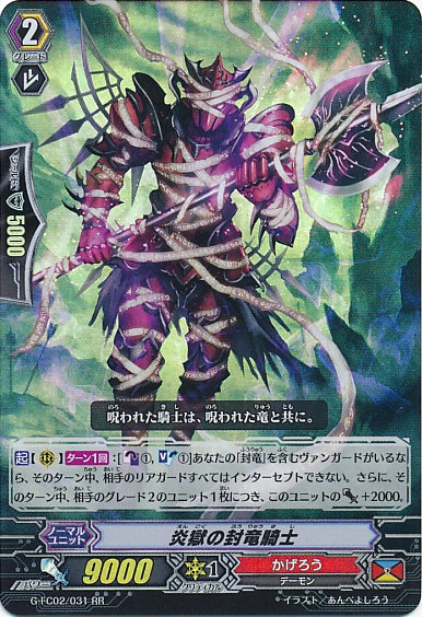 【起】【(R)】【ターン1回】:[【カウンターブラスト】(1),【ソウルブラスト】(1)]あなたの「封竜」を含むヴァンガードがいるなら、そのターン中、相手のリアガードすべてはインターセプトできない。さらに、そのターン中、相手のグレード2のユニット1枚につき、このユニットのパワー+2000。