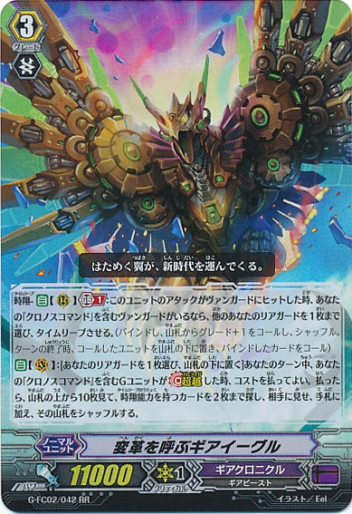 時翔-【自】【(R)】【Gブレイク】(1):このユニットのアタックがヴァンガードにヒットした時、あなたの「クロノスコマンド」を含むヴァンガードがいるなら、他のあなたのリアガードを1枚まで選び、タイムリープさせる。(バインドし、山札からグレード+1をコールし、シャッフル。ターンの終了時、コールしたユニットを山札の下に置き、バインドしたカードをコール)【自】【(V)】:[あなたのリアガードを1枚選び、山札の下に置く]あなたのターン中、あなたの「クロノスコマンド」を含むGユニットが【超越】した時、コストを払ってよい。払ったら、山札の上から10枚見て、時翔能力を持つカードを2枚まで探し、相手に見せ、手札に加え、その山札をシャッフルする。