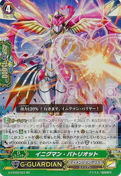 【Gガーディアン】(お互いのヴァンガードがグレード3以上で、あなたのGゾーンの表のGガーディアンが3枚以下なら使える)-相手ターンのガードステップ-[手札から【治】を1枚選び、捨てる]裏のこのカードを(G)にコールする。【自】:このユニットが(G)に登場した時、相手のアタックしているユニットのパワーが20000以上なら、そのバトル中、このユニットのシールド+5000。