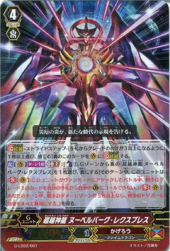 【超越】-ストライドステップ-[手札からグレードの合計が3以上になるように1枚以上選び、捨てる]裏のこのカードを(V)に【超越】する。【起】【(V)】【ターン1回】【Gブレイク】(2):[【カウンターブラスト】(1),Gゾーンから裏の「超越神龍 ヌーベルバーグ・レクスプレス」を1枚選び、表にする]そのターン中、このユニットは『【永】【(V)】:このユニットがヴァンガードにアタックしたバトル中、相手はグレード1のカードを自分の手札から自分の(G)にコールできない。』『【永】【(V)】:あなたのターン中、相手のダメージゾーンが5枚以上なら、相手のトリガーの効果をすべて無効にする。』を得る。