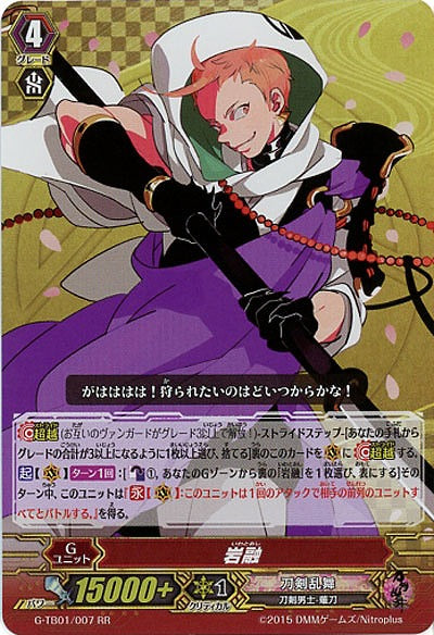 【超越】(お互いのヴァンガードがグレード3以上で解放!)-ストライドステップ-[あなたの手札からグレードの合計が3以上になるように1枚以上選び、捨てる]裏のこのカードを(V)に【超越】する。【起】【(V)】【ターン1回】:[【カウンターブラスト】(1),あなたのGゾーンから裏の「岩融」を1枚選び、表にする]そのターン中、このユニットは『【永】【(V)】:このユニットは1回のアタックで相手の前列のユニットすべてとバトルする。』を得る。