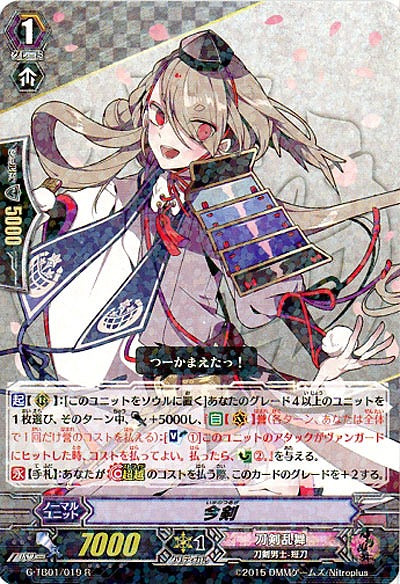 【起】【(R)】:[このユニットをソウルに置く]あなたのグレード4以上のユニットを1枚選び、そのターン中、パワー+5000し、『【自】【(V)】誉(各ターン、あなたは全体で1回だけ誉のコストを払える):[【ソウルブラスト】(1)]このユニットのアタックがヴァンガードにヒットした時、コストを払ってよい。払ったら、【カウンターチャージ】(2)。』を与える。【永】【手札】:あなたが【超越】のコストを払う際、このカードのグレードを+2する。