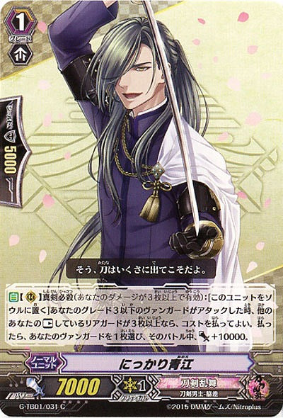 【自】【(R)】真剣必殺(あなたのダメージが3枚以上で有効):[このユニットをソウルに置く]あなたのグレード3以下のヴァンガードがアタックした時、他のあなたの【レスト】しているリアガードが3枚以上なら、コストを払ってよい。払ったら、あなたのヴァンガードを1枚選び、そのバトル中、パワー+10000。