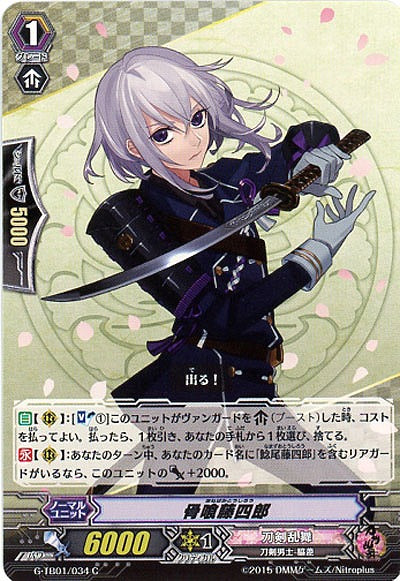 【自】【(R)】:[【ソウルブラスト】(1)]このユニットがヴァンガードを【ブースト】した時、コストを払ってよい。払ったら、1枚引き、あなたの手札から1枚選び、捨てる。【永】【(R)】:あなたのターン中、あなたのカード名に「鯰尾藤四郎」を含むリアガードがいるなら、このユニットのパワー+2000。