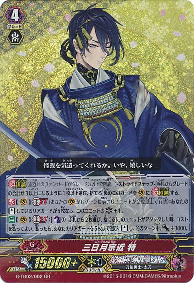 【超越】(お互いのヴァンガードがグレード3以上で解放!)-ストライドステップ-[手札からグレードの合計が3以上になるように1枚以上選び、捨てる]裏のこのカードを(V)に【超越】する。【永】【(V)】【Gブレイク】(2)(あなたの(V)かGゾーンに表のGユニットが2枚以上で有効):あなたの【スタンド】しているリアガードが5枚なら、このユニットのクリティカル+1。【自】【(V)】【Gブレイク】(3):[【カウンターブラスト】(1),手札から2枚選び、捨てる]このユニットがアタックした時、コストを払ってよい。払ったら、あなたのリアガードを5枚まで選び、【スタンド】し、そのターン中、パワー+3000。