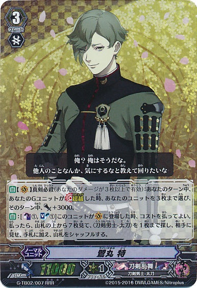 【自】【(V)】真剣必殺(あなたのダメージが3枚以上で有効):あなたのターン中、あなたのGユニットが【超越】した時、あなたのユニットを3枚まで選び、そのターン中、パワー+3000。【自】:[【カウンターブラスト】(1),【ソウルブラスト】(1)]このユニットが(V)に登場した時、コストを払ってよい。払ったら、山札の上から7枚見て、〈刀剣男士-太刀〉を1枚まで探し、相手に見せ、手札に加え、山札をシャッフルする。