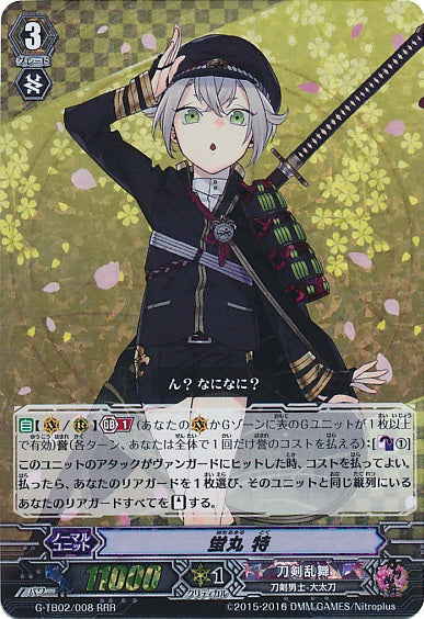 【自】【(V)/(R)】【Gブレイク】(1)(あなたの(V)かGゾーンに表のGユニットが1枚以上で有効)誉(各ターン、あなたは全体で1回だけ誉のコストを払える):[【カウンターブラスト】(1)]このユニットのアタックがヴァンガードにヒットした時、コストを払ってよい。払ったら、あなたのリアガードを1枚選び、そのユニットと同じ縦列にいるあなたのリアガードすべてを【スタンド】する。