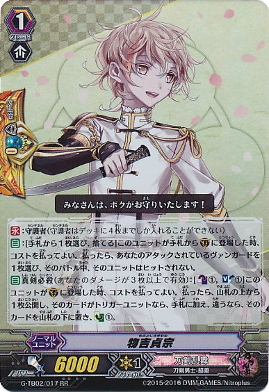【永】:守護者(守護者はデッキに4枚までしか入れることができない)【自】:[手札から1枚選び、捨てる]このユニットが手札から(G)に登場した時、コストを払ってよい。払ったら、あなたのアタックされているヴァンガードを1枚選び、そのバトル中、そのユニットはヒットされない。【自】真剣必殺(あなたのダメージが3枚以上で有効):[【カウンターブラスト】(1),【ソウルブラスト】(1)]このユニットが(G)に登場した時、コストを払ってよい。払ったら、山札の上から1枚公開し、そのカードがトリガーユニットなら、手札に加え、違うなら、そのカードを山札の下に置き、【カウンターチャージ】(1)。