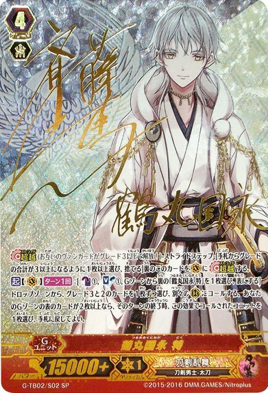 【超越】(お互いのヴァンガードがグレード3以上で解放!)-ストライドステップ-[手札からグレードの合計が3以上になるように1枚以上選び、捨てる]裏のこのカードを(V)に【超越】する。【起】【(V)】【ターン1回】:[【カウンターブラスト】(1),【ソウルブラスト】(1),Gゾーンから裏の「鶴丸国永 特」を1枚選び、表にする]ドロップゾーンから、グレード3と2のカードを1枚ずつ選び、別々の(R)にコールする。あなたのGゾーンの表のカードが2枚以上なら、そのターンの終了時、この効果でコールされたユニットを1枚選び、手札に戻してよい。