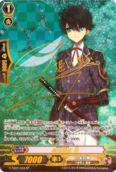 二刀開眼-【自】【(R)】【Gブレイク】(1)(あなたの(V)かGゾーンに表のGユニットが1枚以上で有効):このユニットが〈刀剣男士-打刀〉をブーストした時、そのバトル中、ブーストされたユニットのパワー+3000し、そのユニットが二刀開眼の能力を持つなら、そのバトル中、このユニットのパワー+3000。