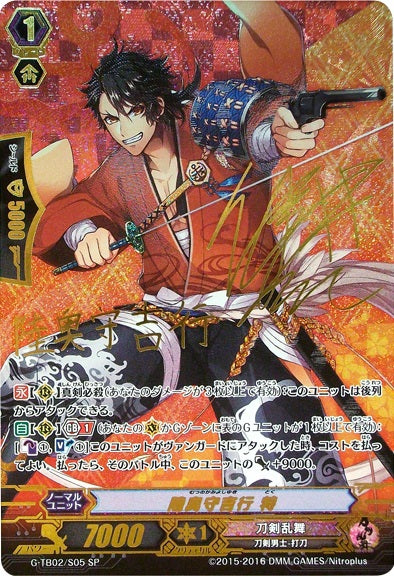【永】【(R)】真剣必殺(あなたのダメージが3枚以上で有効):このユニットは後列からアタックできる。【自】【(R)】【Gブレイク】(1)(あなたの(V)かGゾーンに表のGユニットが1枚以上で有効):[【カウンターブラスト】(1),【ソウルブラスト】(1)]このユニットがヴァンガードにアタックした時、コストを払ってよい。払ったら、そのバトル中、このユニットのパワー+9000。