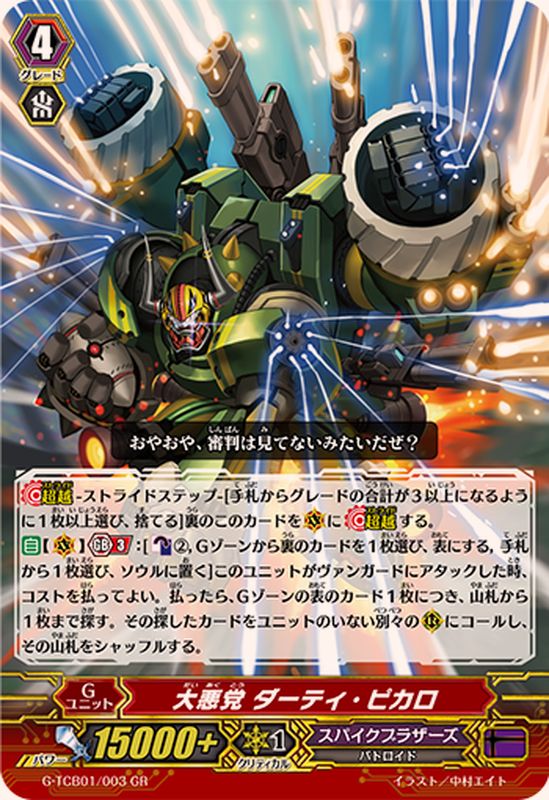 【超越】-ストライドステップ-[手札からグレードの合計が3以上になるように1枚以上選び、捨てる]裏のこのカードを(V)に【超越】する。【自】【(V)】【Gブレイク】(3):[【カウンターブラスト】(2),Gゾーンから裏のカードを1枚選び、表にする,手札から1枚選び、ソウルに置く]このユニットがヴァンガードにアタックした時、コストを払ってよい。払ったら、Gゾーンの表のカード1枚につき、山札から1枚まで探す。その探したカードをユニットのいない別々の(R)にコールし、その山札をシャッフルする。