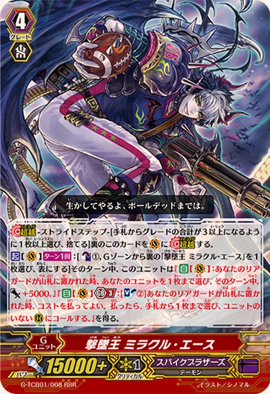 【超越】-ストライドステップ-[手札からグレードの合計が3以上になるように1枚以上選び、捨てる]裏のこのカードを(V)に【超越】する。【起】【(V)】【ターン1回】:[【カウンターブラスト】(1),Gゾーンから裏の「撃墜王 ミラクル・エース」を1枚選び、表にする]そのターン中、このユニットは『【自】【(V)】:あなたのリアガードが山札に置かれた時、あなたのユニットを1枚まで選び、そのターン中、パワー+5000。』『【自】【(V)】【Gブレイク】(3):[【ソウルブラスト】(2)]あなたのリアガードが山札に置かれた時、コストを払ってよい。払ったら、手札から1枚まで選び、ユニットのいない(R)にコールする。』を得る。