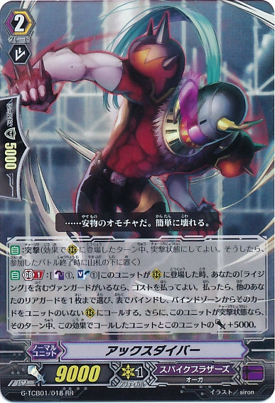 【自】:突撃(効果で(R)に登場したターン中、突撃状態にしてよい。そうしたら、参加したバトル終了時に山札の下に置く)【自】【Gブレイク】(1):[【カウンターブラスト】(1),【ソウルブラスト】(1)]このユニットが(R)に登場した時、あなたの「ライジング」を含むヴァンガードがいるなら、コストを払ってよい。払ったら、他のあなたのリアガードを1枚まで選び、表でバインドし、バインドゾーンからそのカードをユニットのいない(R)にコールする。さらに、このユニットが突撃状態なら、そのターン中、この効果でコールしたユニットとこのユニットのパワー+5000。