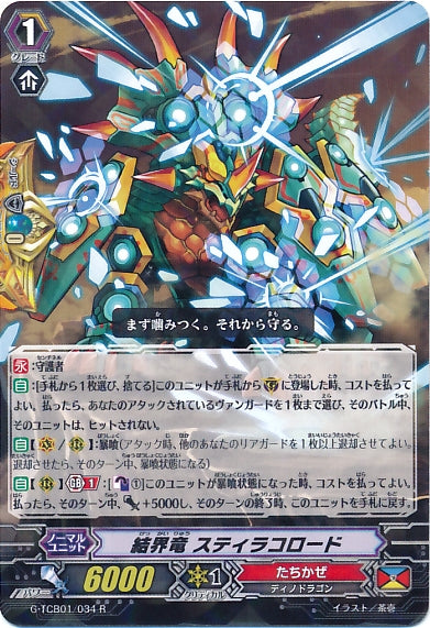 【永】:守護者【自】:[手札から1枚選び、捨てる]このユニットが手札から(G)に登場した時、コストを払ってよい。払ったら、あなたのアタックされているヴァンガードを1枚まで選び、そのバトル中、そのユニットは、ヒットされない。【自】【(V)/(R)】:暴喰(アタック時、他のあなたのリアガードを1枚以上退却させてよい。退却させたら、そのターン中、暴喰状態になる)【自】【(R)】【Gブレイク】(1):[【カウンターブラスト】(1)]このユニットが暴喰状態になった時、コストを払ってよい。払ったら、そのターン中、パワー+5000し、そのターンの終了時、このユニットを手札に戻す。