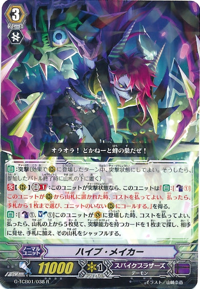 【自】:突撃(効果で(R)に登場したターン中、突撃状態にしてよい。そうしたら、参加したバトル終了時に山札の下に置く)【永】【(R)】【Gブレイク】(1):このユニットが突撃状態なら、このユニットは『【自】:[【カウンターブラスト】(1)]このユニットが(R)から山札に置かれた時、コストを払ってよい。払ったら、手札から1枚まで選び、ユニットのいない(R)にコールする。』を得る。【自】:[【カウンターブラスト】(1),【ソウルブラスト】(1)]このユニットが(V)に登場した時、コストを払ってよい。払ったら、山札の上から5枚見て、突撃能力を持つカードを1枚まで探し、相手に見せ、手札に加え、その山札をシャッフルする。